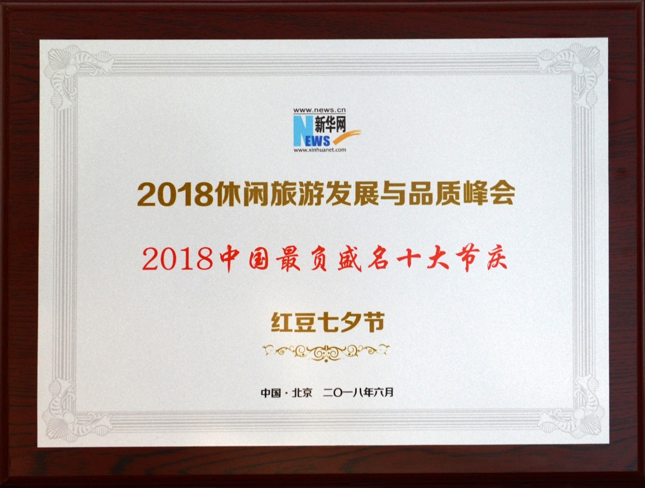 ? ? ? ? ?打造“美麗中國”,共創(chuàng)“美好生活”,6月24日,由新華通訊社主辦的“2018休閑旅游發(fā)展與品質(zhì)峰會”在北京召開。峰會發(fā)布了“首批國民休閑旅游勝地、年度旅游匠心企業(yè)品牌、2018中國最負(fù)盛名節(jié)慶(節(jié)會)”名單?!凹t豆七夕節(jié)”榮膺“2018年最負(fù)盛名十大節(jié)慶”。