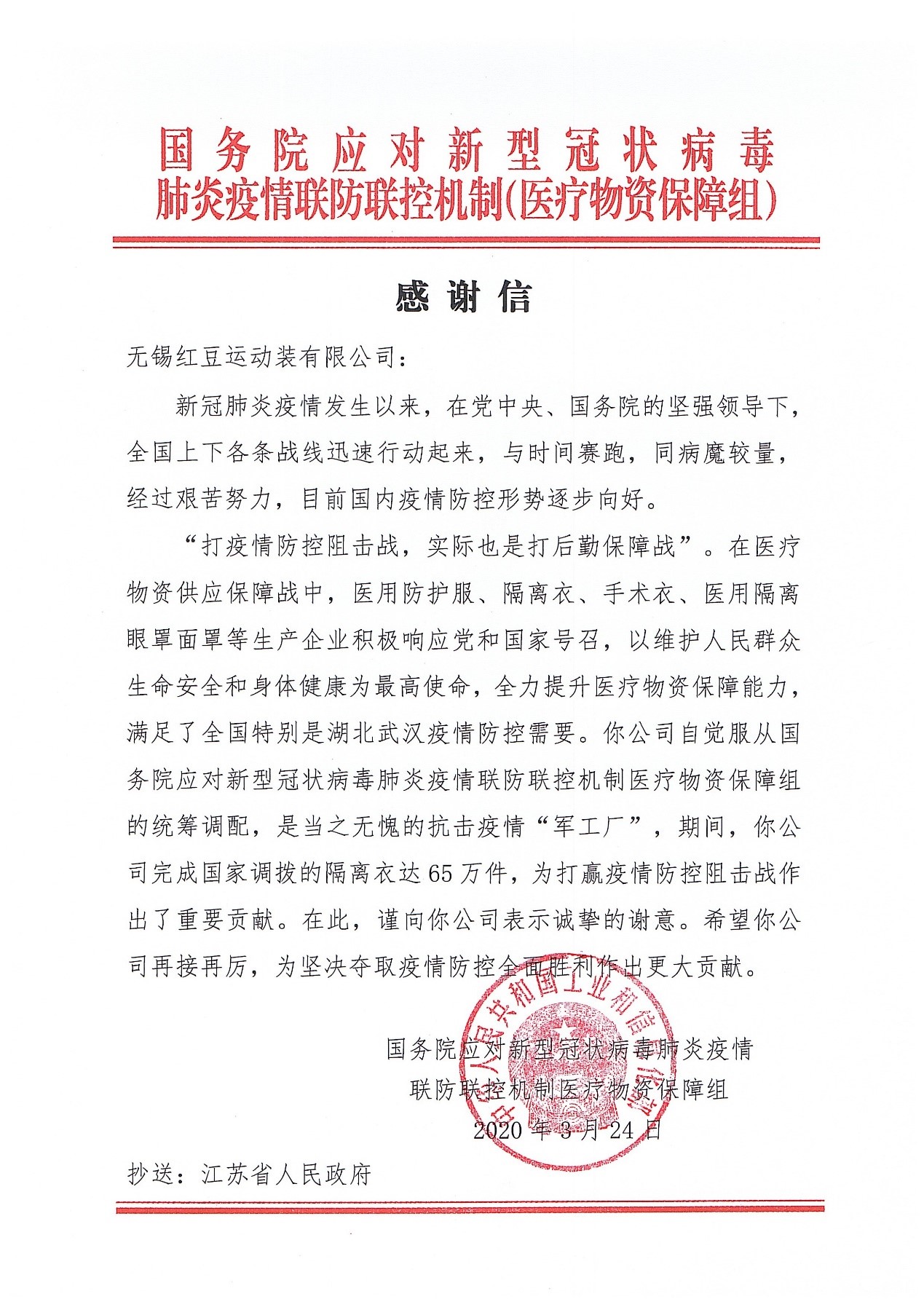 因?yàn)榧t豆在抗擊疫情中作出的貢獻(xiàn),國務(wù)院應(yīng)對新型冠狀病毒肺炎疫情聯(lián)防聯(lián)控機(jī)制(醫(yī)療物資保障組)給紅豆發(fā)來感謝信,稱贊紅豆為抗擊疫情當(dāng)之無愧的“軍工廠”。9月8日,在全國抗擊新冠肺炎疫情表彰大會上,周海江榮獲 “全國抗擊新冠肺炎疫情先進(jìn)個人”“全國優(yōu)秀共產(chǎn)黨員”兩項(xiàng)殊榮,是同時獲得兩項(xiàng)殊榮的唯一民營企業(yè)家。