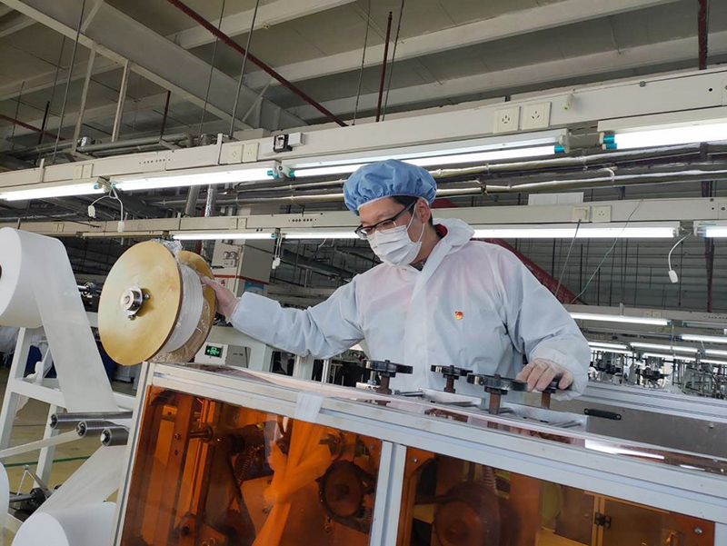 尚慶軍,紅豆黨員突擊隊的一位“拼命三郎”。已有9年黨齡的尚慶軍,不僅要做好疫情防控的“守門人”,檢測和登記每一位進(jìn)出人員的體溫,同時早中晚三次還要對工廠的各個角落進(jìn)行消毒,確??谡稚a(chǎn)線改造順利進(jìn)行?!皬?月2號開始上班,已經(jīng)連續(xù)20多天沒有陪伴家人。”尚慶軍說,“看著原材料從入口進(jìn)去,一只只潔白的口罩從出口自動下線,我就感覺特別激動,特想哭?!?/span>