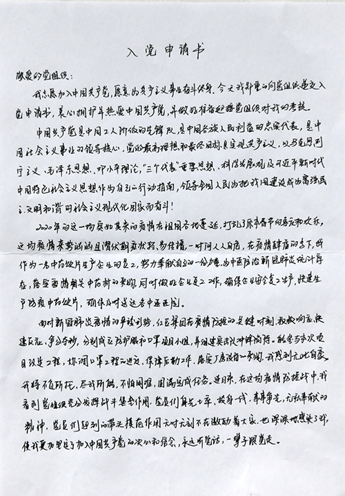 紅豆集團(tuán)國(guó)際公司的員工梁艷的再次向黨組織遞交入黨申請(qǐng)書(shū)的原因很簡(jiǎn)單,“為了支持一線疫情防控,集團(tuán)緊急組建黨員突擊隊(duì)支援防護(hù)服、口罩生產(chǎn)線,負(fù)責(zé)最緊急、最艱苦的工作。我也報(bào)名了,因我還不是黨員,所以沒(méi)有把最重的任務(wù)安排給我?!笔艿缴磉咟h員的激勵(lì),讓梁艷鼓起勇氣,擬出了這份“疫情火線入黨申請(qǐng)書(shū)”。